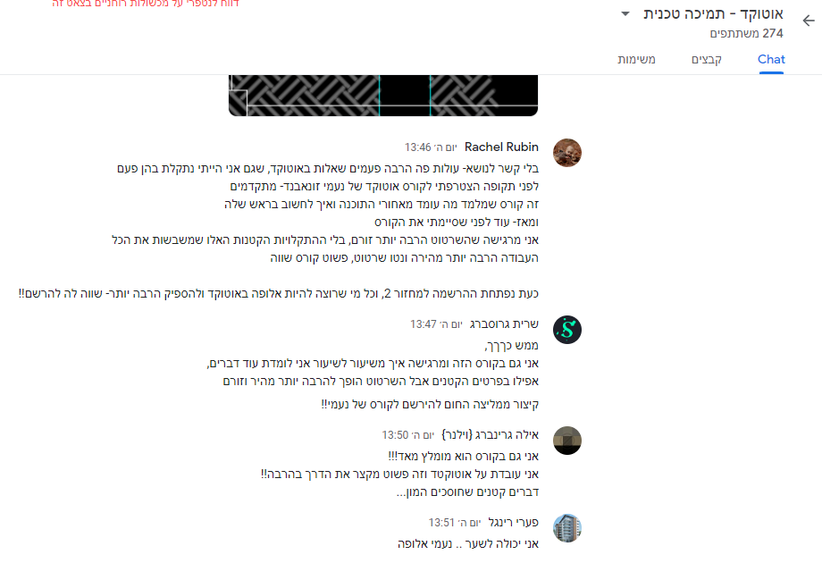כאשר חלק ניכר מהתלמידות הן כאלה שבאמת יודעות אוטוקד טוב ואפילו מאוד! זו היתה חוויה מאתגרת וב"ה מוצלחת!