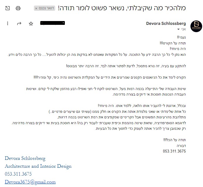ואני כ"כ שמחה שלקחתי את השיעורים פשוט שווה שווה שווה.